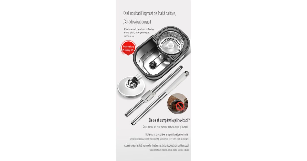 Centrifugás és 360 fokos forgatható felmosóvödör szett rozsdamentes acélból, Arvada® MagicClean, ovális vödör, méretek 42x26x22cm, fényes felület és vízleeresztő nyílás 4 utántöltővel, fehér, vélemények