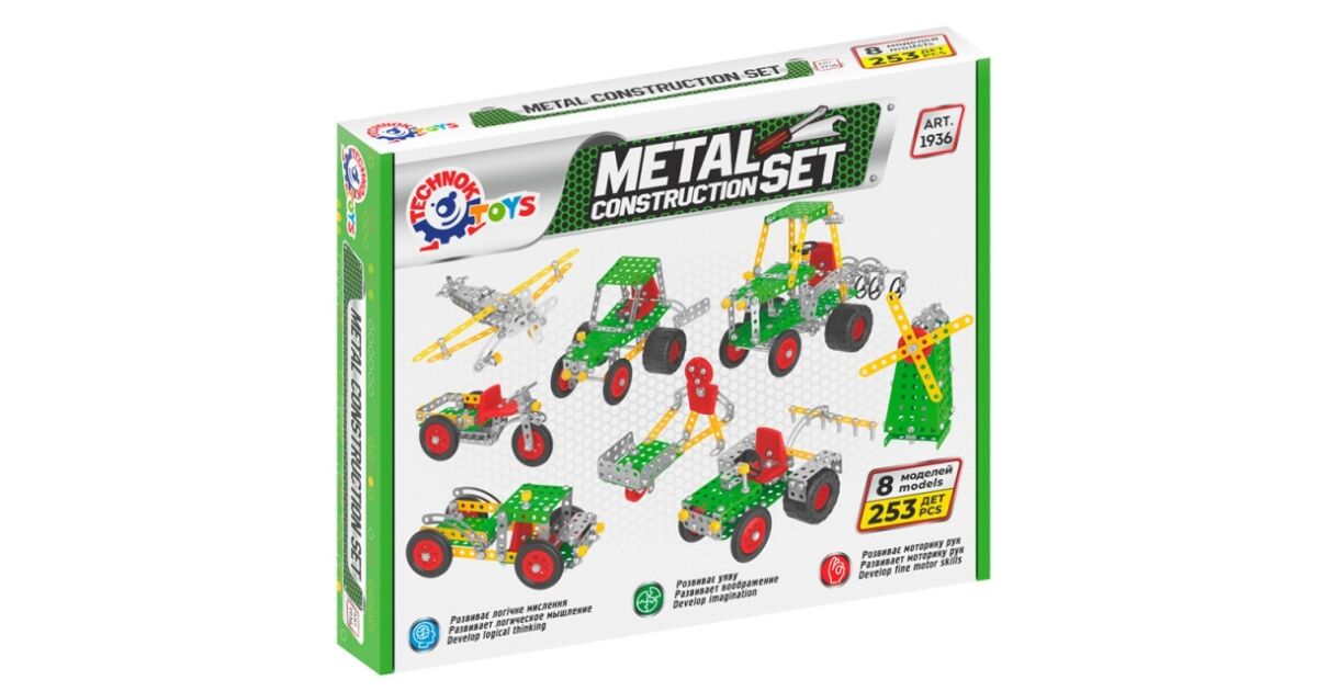 Ez a TechnoK fém konstrukciós készlet 253 darabból áll, és lehetőséget ad 8 különböző mezőgazdasági jármű modelljének építésére. A fém és műanyag alkatrészekből robusztus és valósághű modellek építhetők.