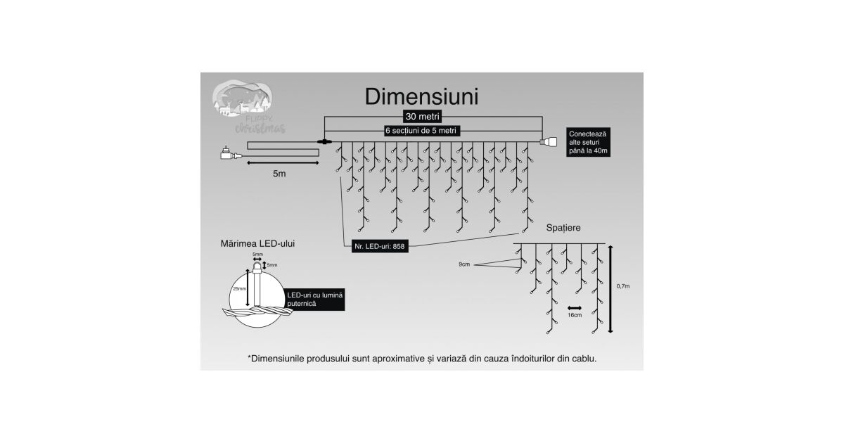 Craciun Turturi Fényfüggöny, IP44, 30 m, 858 LED, Kék, Transzformátor 31 V, Teljesítmény 9 W, Összeköthető, Beltéri/Kültéri, 5 m kábel leírása