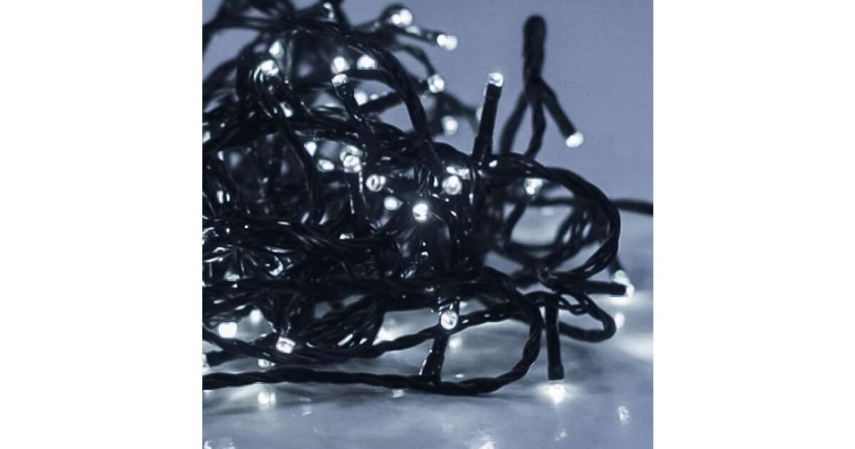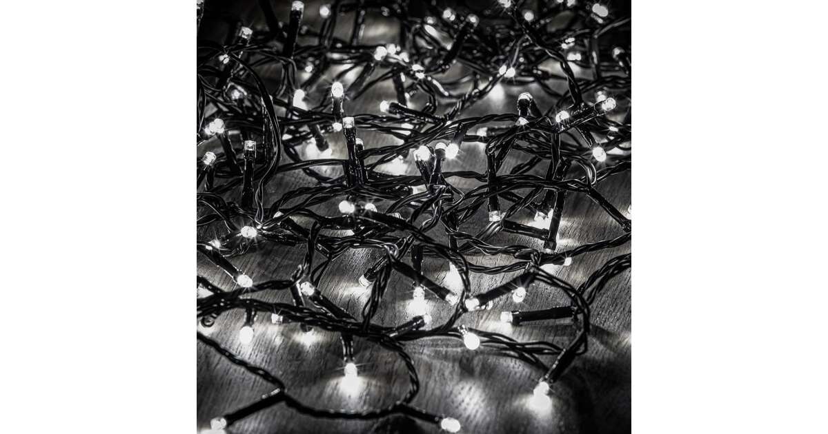 Varázsolj otthonodba ünnepi hangulatot ezzel a 9 méter hosszú, 180 db hideg fehér LED-del ellátott kül- és beltéri fényfüzérrel! A zöld kábel szinte láthatatlan a fenyőfán, de minden sötét háttéren gyönyörűen kiemeli a fényeket.