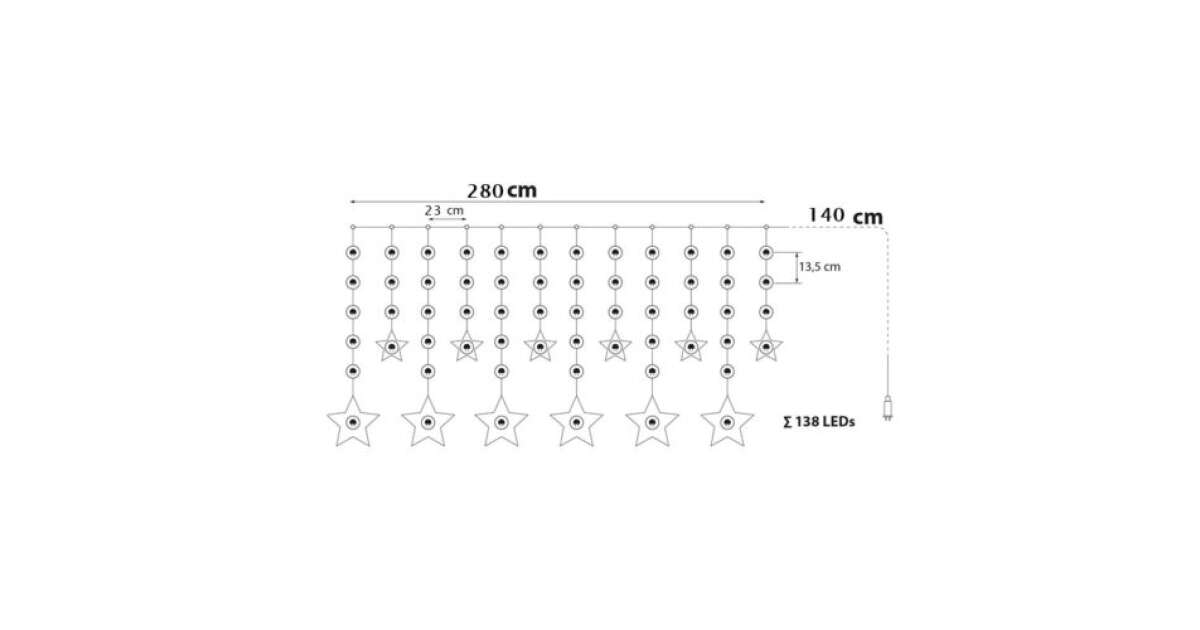 Varázsolj karácsonyi hangulatot otthonodba ezzel a gyönyörű, 3x1 méteres fényfüggönnyel! 12 varázslatos csillag (6 kicsi és 6 nagy) ragyog 138 LED-del, 8 különböző programmal. A fényfüggöny vége csatlakozóval van ellátva, így több függönyt is sorba köthet, hogy a kívánt hosszúságot elérje.