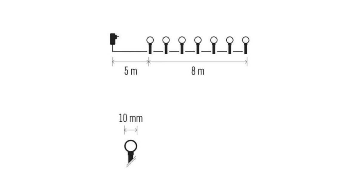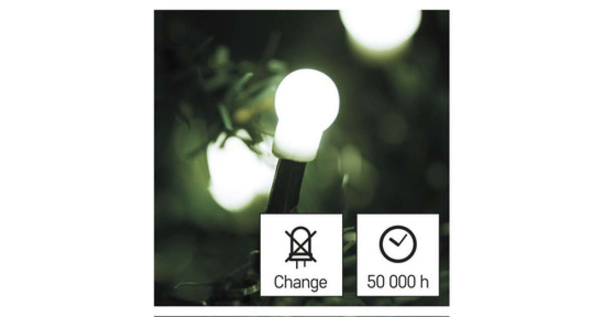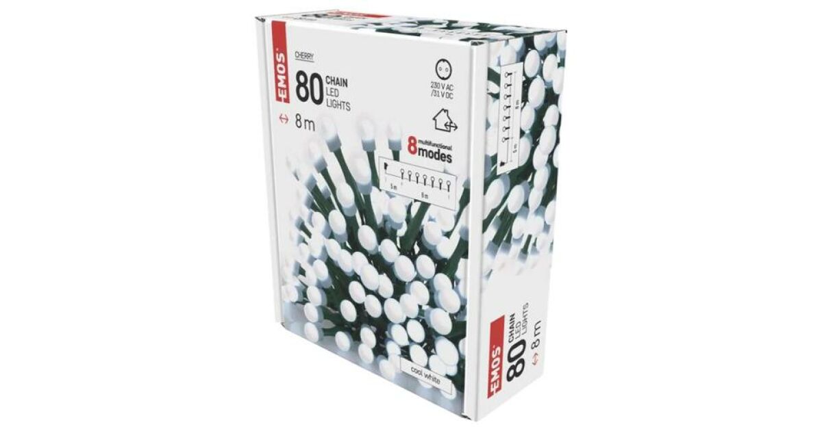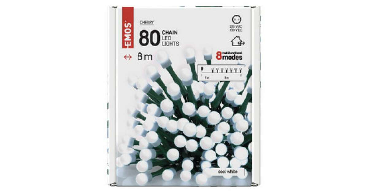 Ezt a terméket így is ismerheted: Emos D5AC06 karácsonyi fényfüzér, cseresznye- golyók, 8m, 80LED, hideg fehér, kül- és beltéri, 8 program