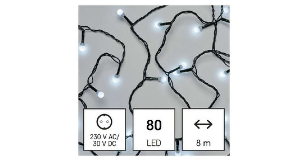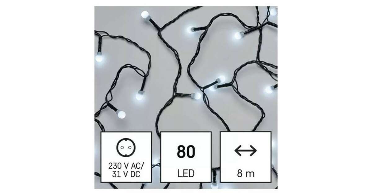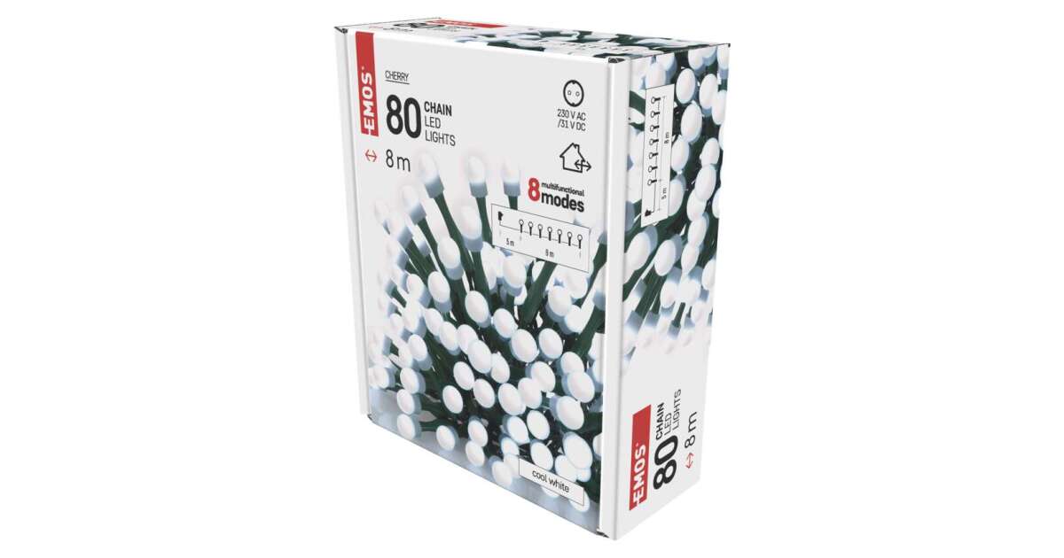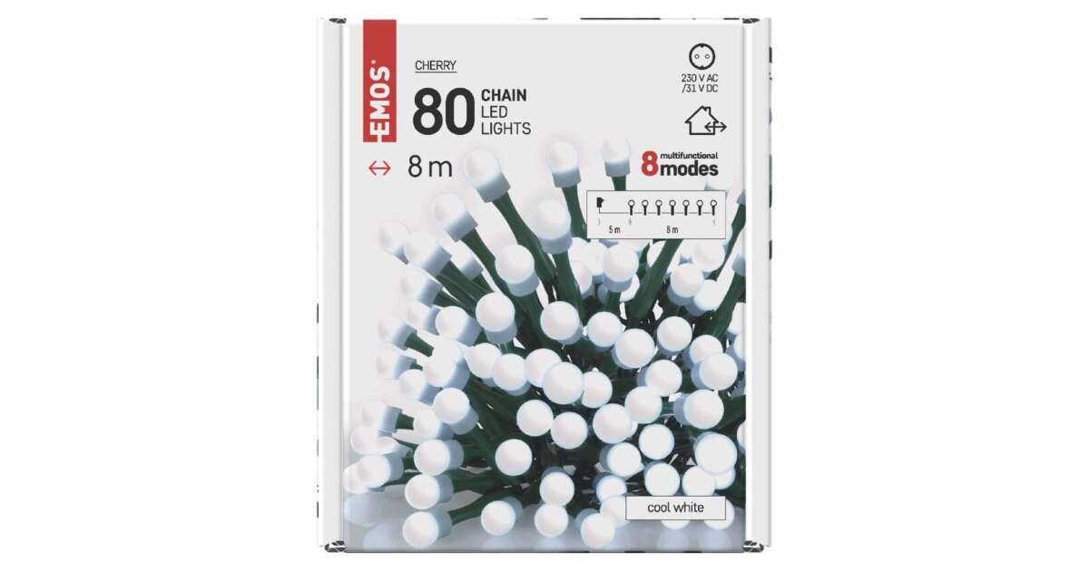 Emos D5AC06 karácsonyi fényfüzér, cseresznye- golyók, 8m, 80LED, hideg fehér, kül- és beltéri, 8 program