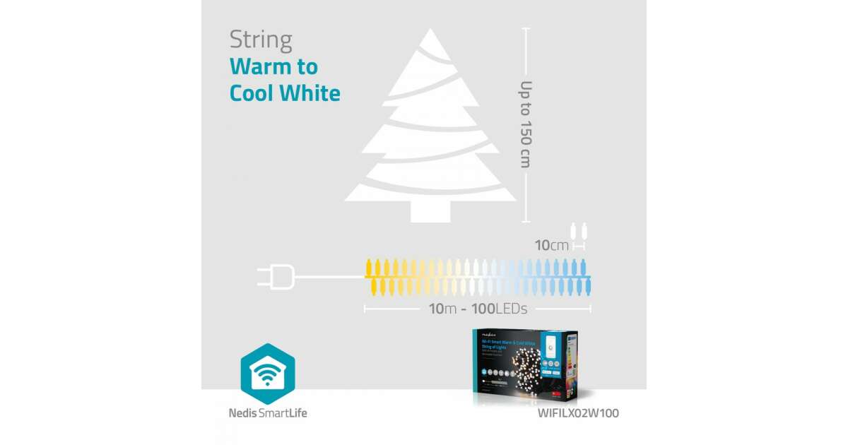 Díszítsd otthonodat ezzel a 10 méteres, 100 LED-es okos LED szalaggal, amely meleg és hideg fehér fényekkel varázsol hangulatos légkört. A beépített Wi-Fi segítségével könnyedén vezérelheted okostelefonodról az ingyenes Nedis SmartLife applikációval.