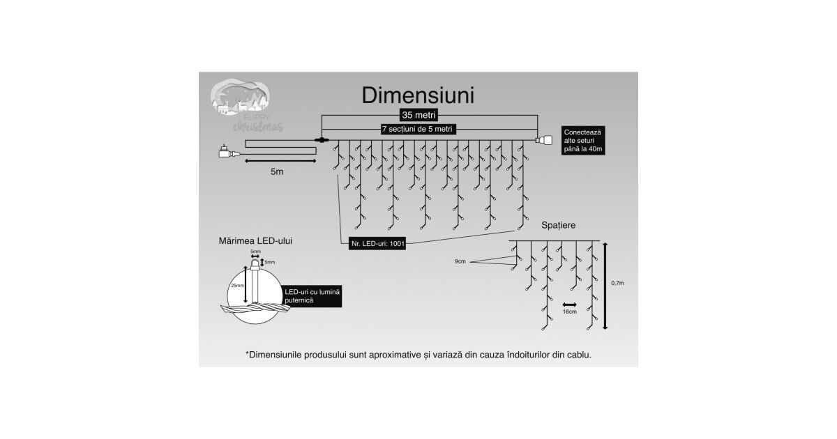 Turturi karácsonyi Fényfüzér, IP44, 35 m, 1001 LED, Meleg fehér, Transzformátor 31 V, Összeköthető, Beltéri/Kültéri, 5 m hosszabbító leírása