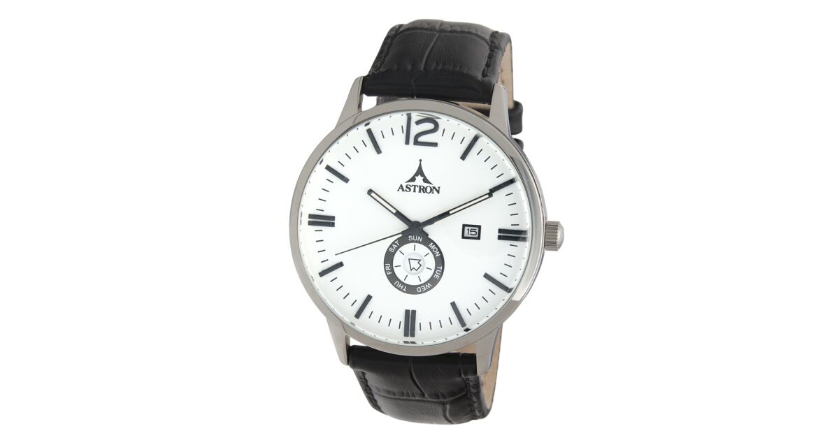 ASTRON 5554-7 férfi karóra, ezüst színű nemesacél tok, fekete bőrszíj, fehér számlap, keményített ásványüveg, multifunkciós quartz szerkezet, 50 m (5 ATM) vízállóság vélemények