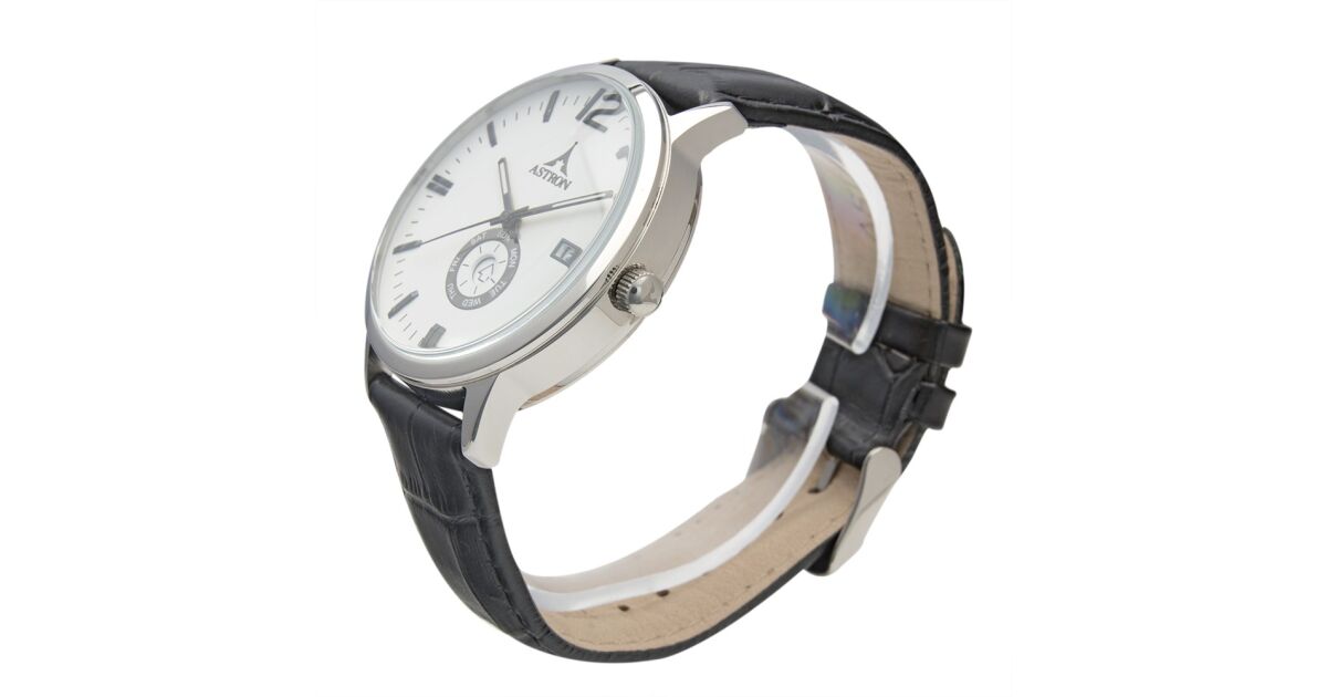 ASTRON 5554-7 férfi karóra, ezüst színű nemesacél tok, fekete bőrszíj, fehér számlap, keményített ásványüveg, multifunkciós quartz szerkezet, 50 m (5 ATM) vízállóság