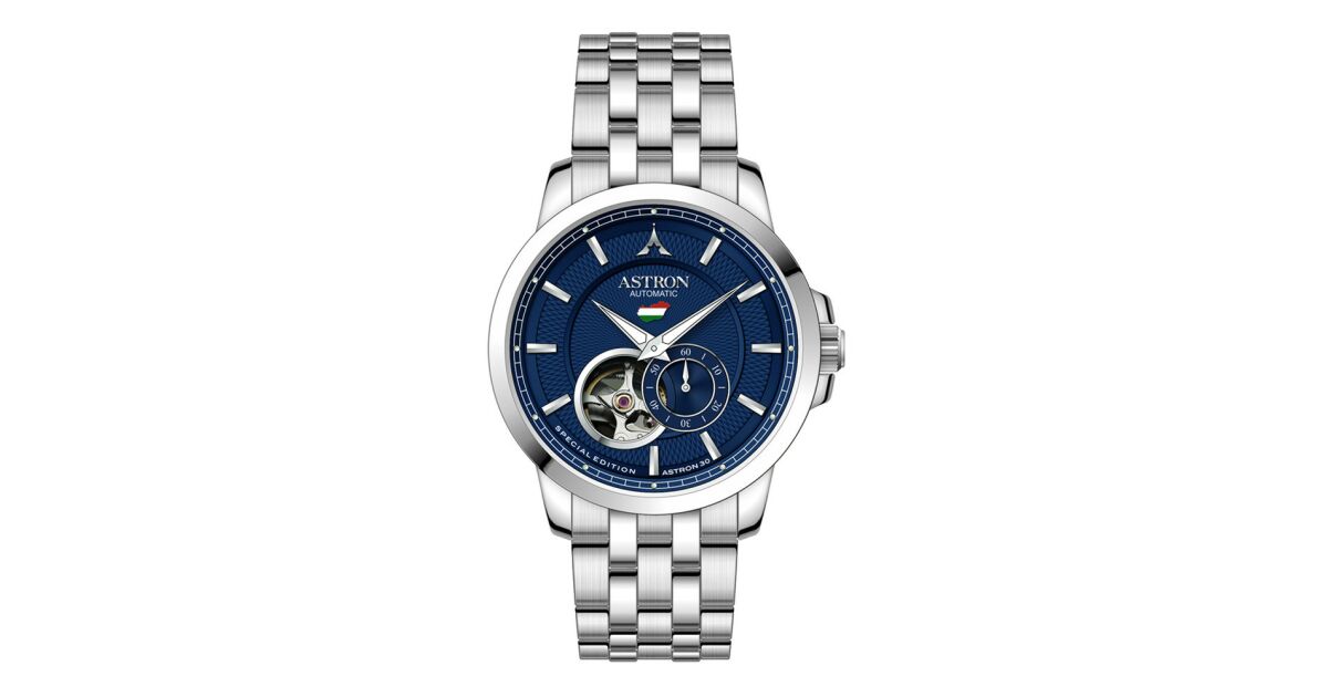 ASTRON 8060-2 sorszámozott automata férfi karóra, ezüst nemesacél tok, ezüst nemesacél csat, kék számlap, zafír üveg, mechanikus automata szerkezet, WR50M vízállóság
