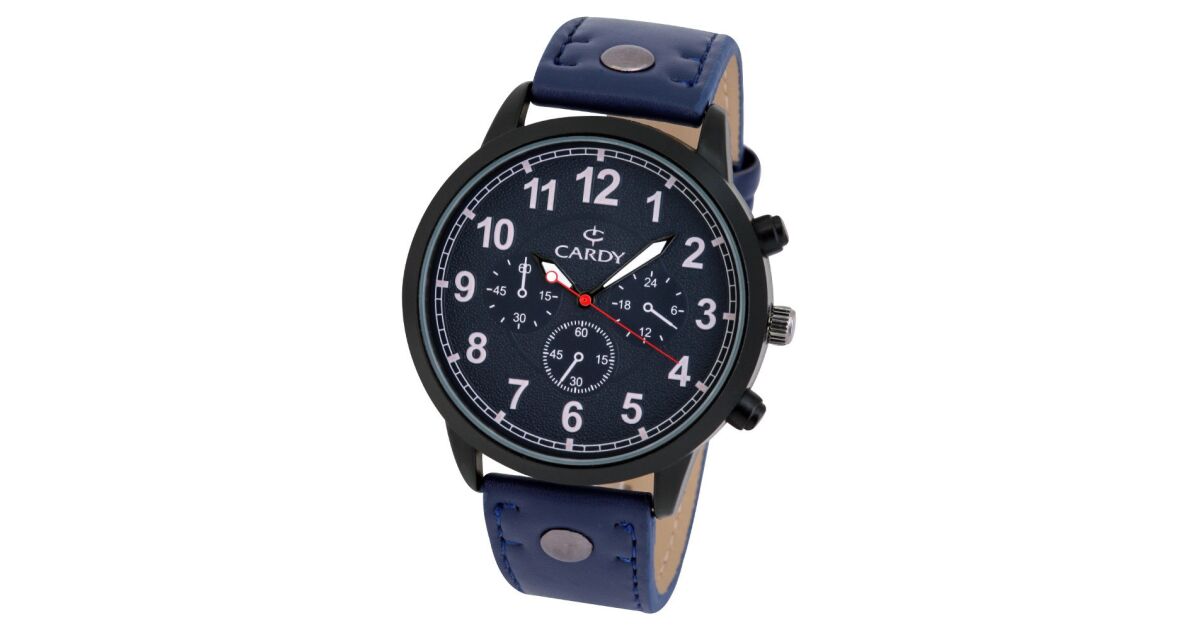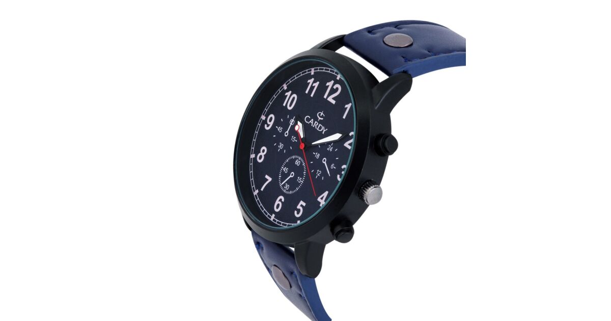 Ezt a terméket így is ismerheted: Cardy férfi karóra, fekete színű fémtok, kék szíj, kék számlap, quartz szerkezet, cseppmentes vízállóság