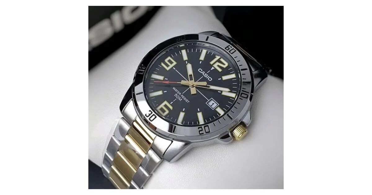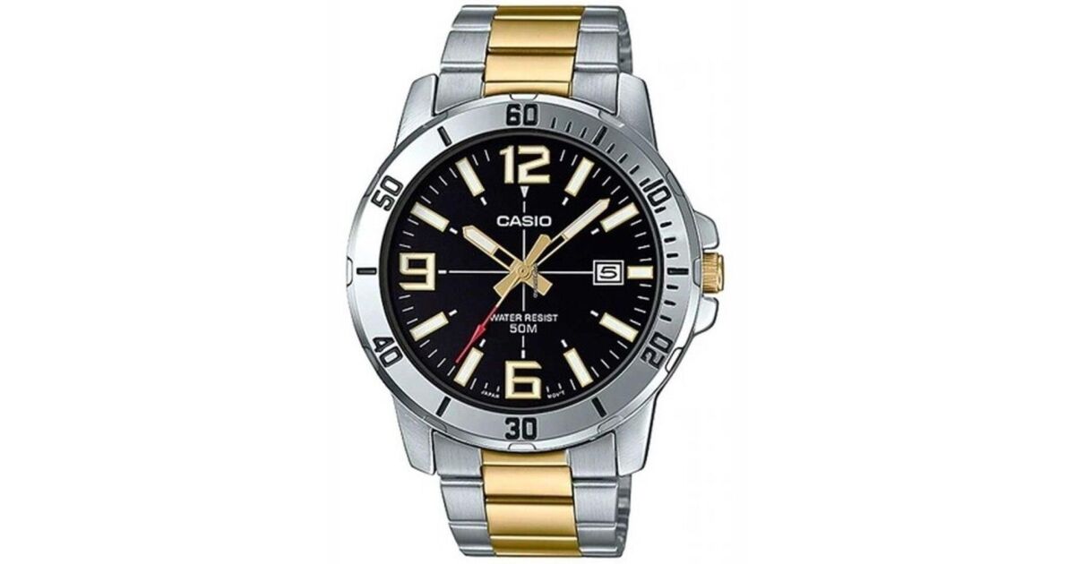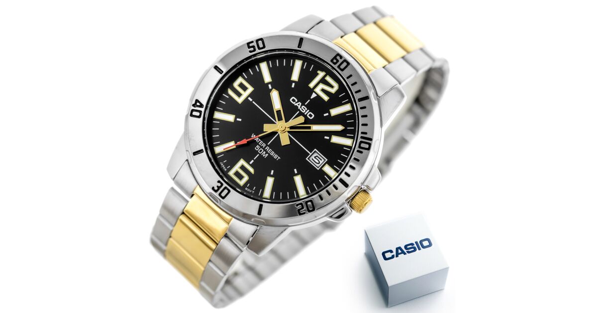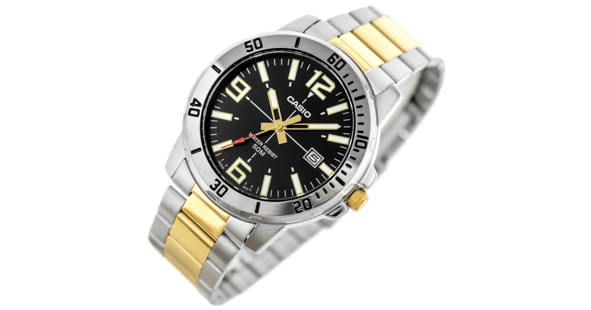 Ezt a terméket így is ismerheted: Casio férfi karóra, ezüst-arany acél szíj, fekete számlap, WR50, kvarc