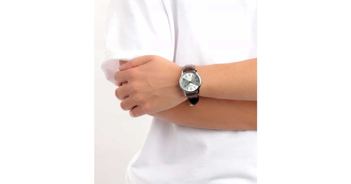 - Stílusos megjelenés: Ezüst számlap barna bőrszíjjal