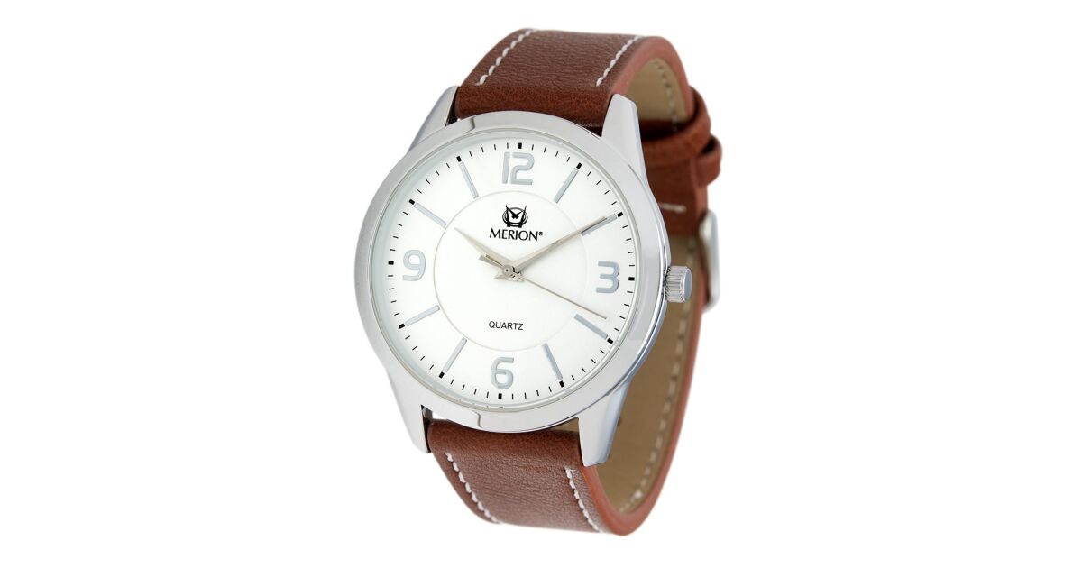 Merion férfi karóra, ezüst színű fém tok, barna színű szíj, fehér színű számlap, ásványüveg, quartz szerkezet, cseppmentesség vélemények