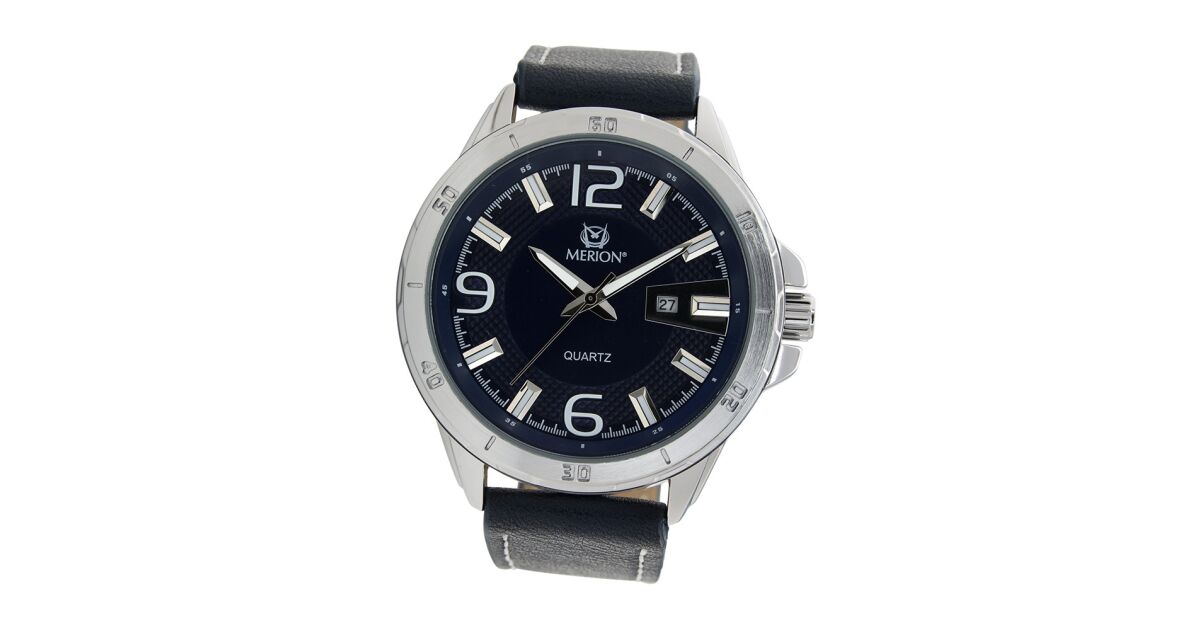 Ezt a terméket így is ismerheted: Merion férfi karóra, ezüst színű fém tok, kék színű szíj, kék színű számlap, ásványüveg, quartz szerkezet, cseppmentesség