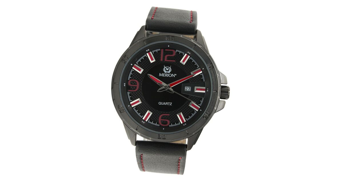 Ezt a terméket így is ismerheted: Merion férfi karóra, fekete színű fém tok, fekete színű szíj, fekete/bordó színű számlap, ásványüveg, quartz szerkezet, cseppmentesség
