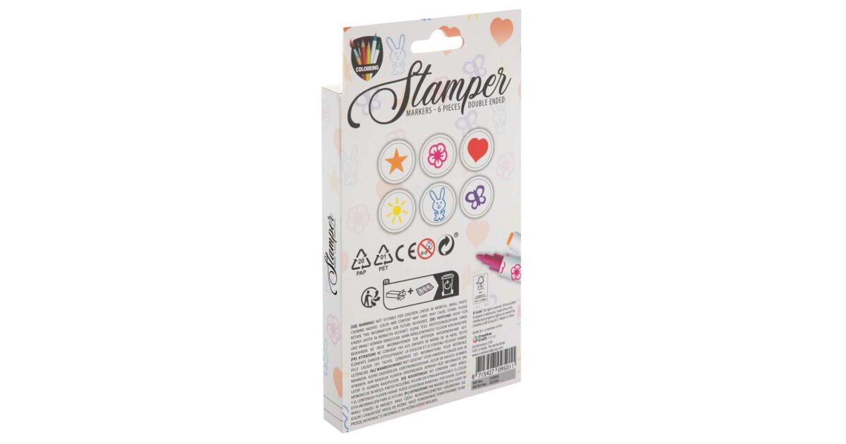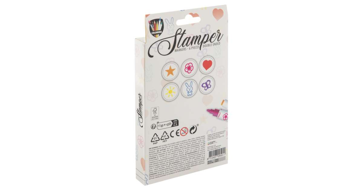 Vidám, kreatív szórakozás kicsiknek és nagyoknak! Ez a 6 db-os filctoll készlet 6 különböző színben (rózsaszín, piros, narancs, sárga, kék, lila) érkezik, mindegyikhez egyedi bélyegző tartozik. A vidám minták (nap ☀️, virág 🌺, szív ❤️, pillangó 🦋, nyúl 🐰, csillag ⭐) garantálják a kreatív önkifejezést.