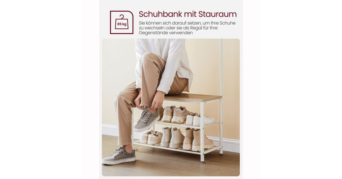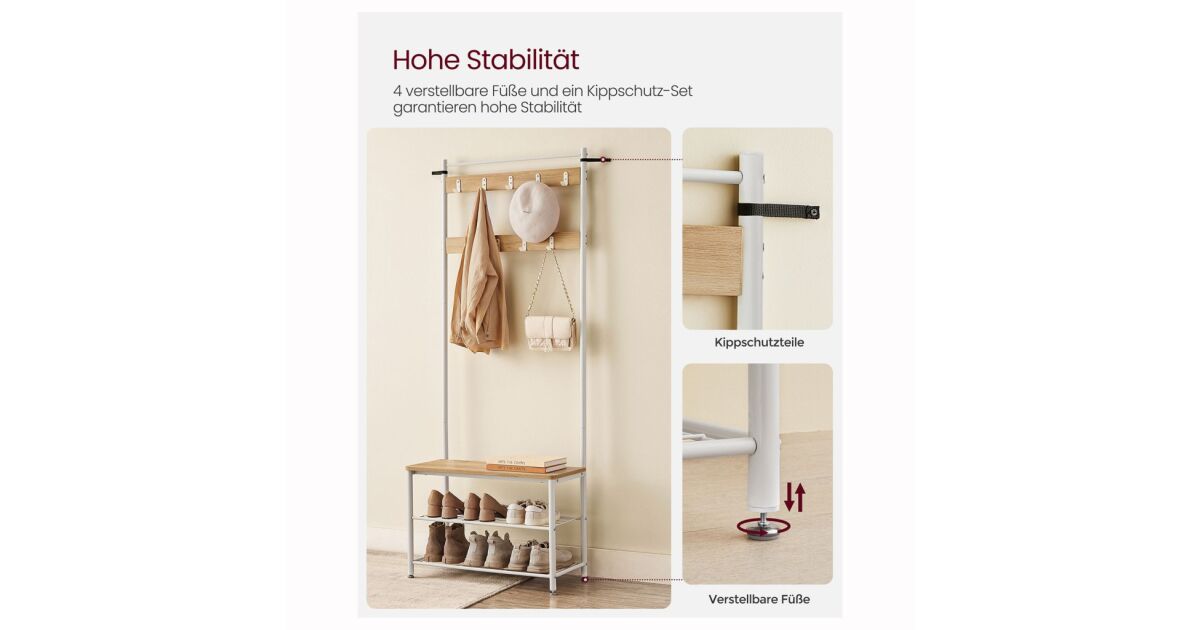 3 az 1-ben Kabáttartó: Kabátakasztók, cipőpad és cipőtartó—ez az egyetlen, többfunkciós előszobai tárolóegység minden igényét kielégíti, legyen szó ruhák felakasztásáról, cipők rendszerezéséről vagy leülésről a cipő fel- vagy levételéhez9 Masszív Akasztó: 9 rozsdamentes fém akasztó 2 sorban, mindegyik akár 3 kg-ot is elbír, masszív és tartós, rengeteg akasztási helyet biztosítva kabátoknak, táskáknak, kalapoknak, sálaknak és egyéb útközbeni tárgyaknak—tökéletes hosszú távú használatraMasszív és Stabil: Egy masszív acélkeret által támogatva és 4 állítható lábbal kiegyenlítve, ez az előszobai kabáttartó stabil támaszt nyújt tárgyainak; a mellékelt dőlésgátló készlet növeli az általános stabilitástCipőpad Polcokkal: Ennek a kabáttartónak a padja lehetővé teszi, hogy kényelmesen leüljön, köszönhetően a 90 kg-os teherbírásnak. Használhatja tárolópolcként is cipősdobozok és tárolóedények rendszerezésére, vagy növények és dekorációk kiállításáraKönnyen Összeszerelhető: Az egyszerű szerkezetnek, számozott alkatrészeknek és egyértelmű utasításoknak köszönhetően problémamentesen összeszerelheti ezt a cipőtárolós kabáttartót