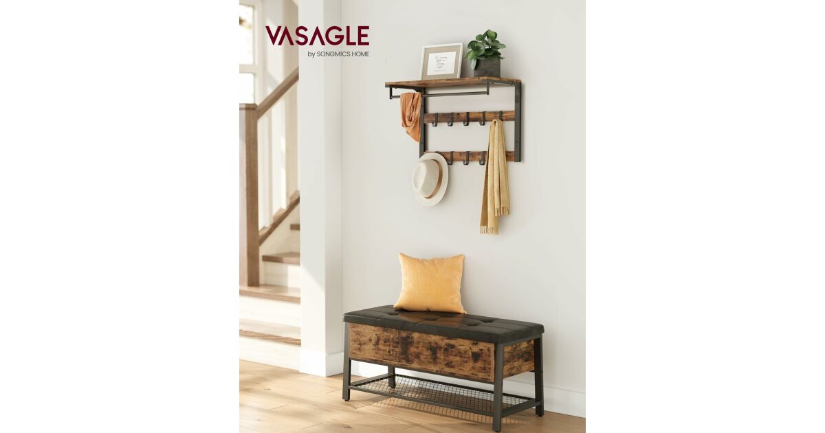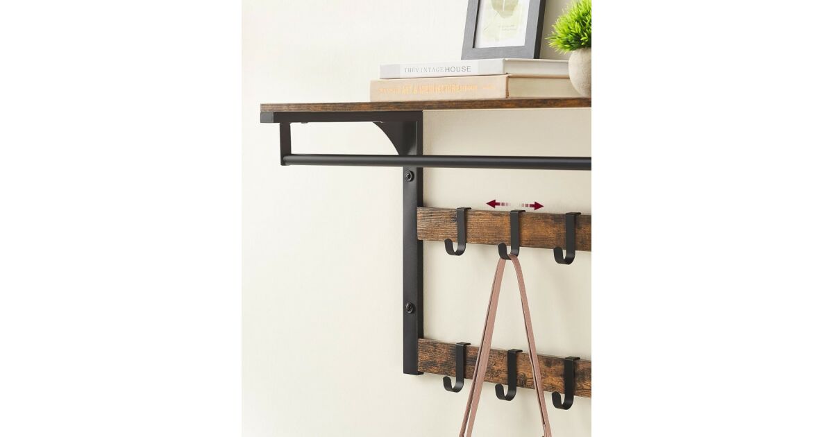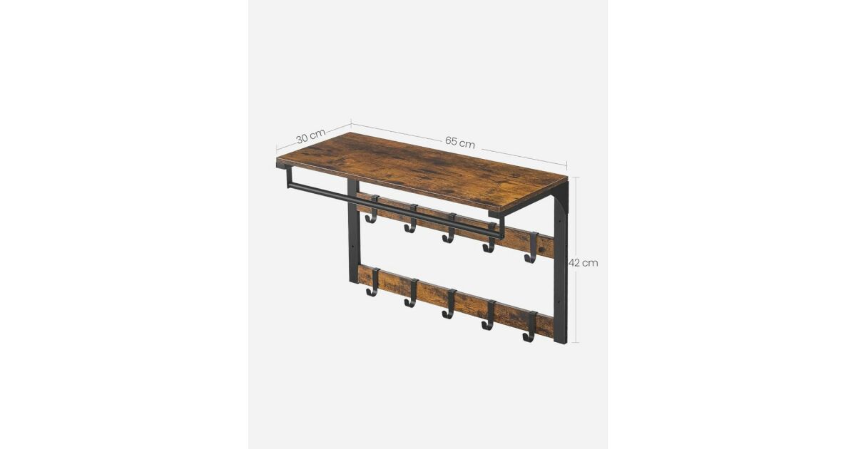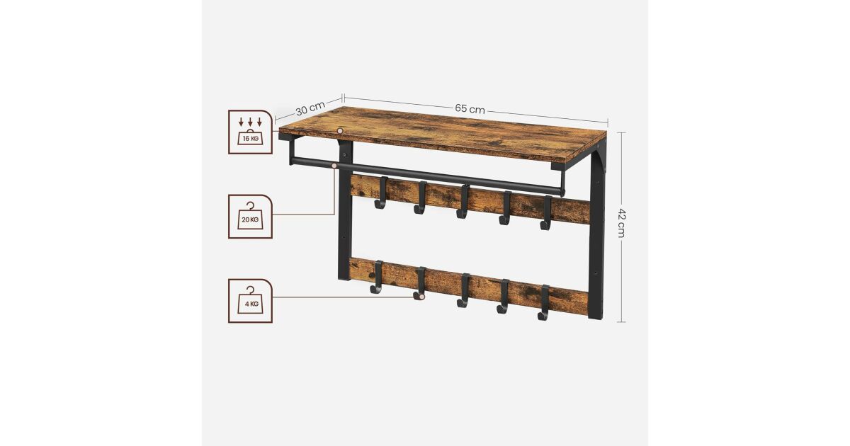 Ez a stílusos és praktikus fali kabáttartó tökéletes megoldás a ruházat és kiegészítők tárolására. Rusztikus barna színével és fekete fém elemeivel modern, mégis otthonos hangulatot teremt. A felső polc extra tárolóhelyet biztosít, míg a levehető kampók és a ruhatartó rúd gondoskodik a ruhák és táskák rendezett elhelyezéséről.