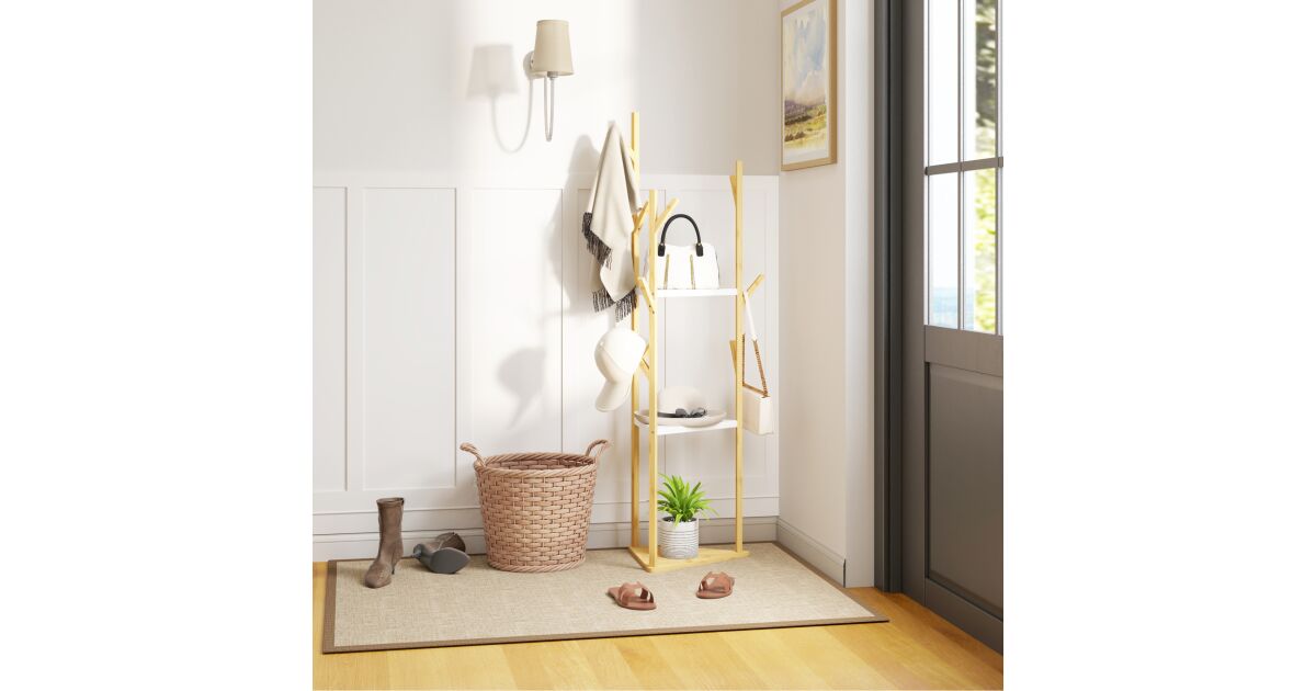 HOMCOM Bambusz Padló Akasztó Fa Formában 8 Akasztóval és 3 Polccal, 45x45x170 cm, Fehér