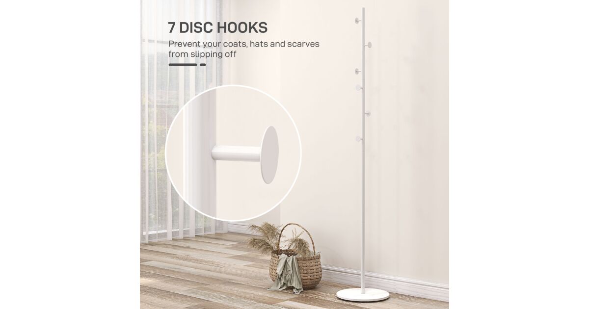 HOMCOM Öntartó Függőleges Kabáttartó 6 Korong Alakú Akasztóval és Palakő Talppal, Ø32x171 cm, Fehér