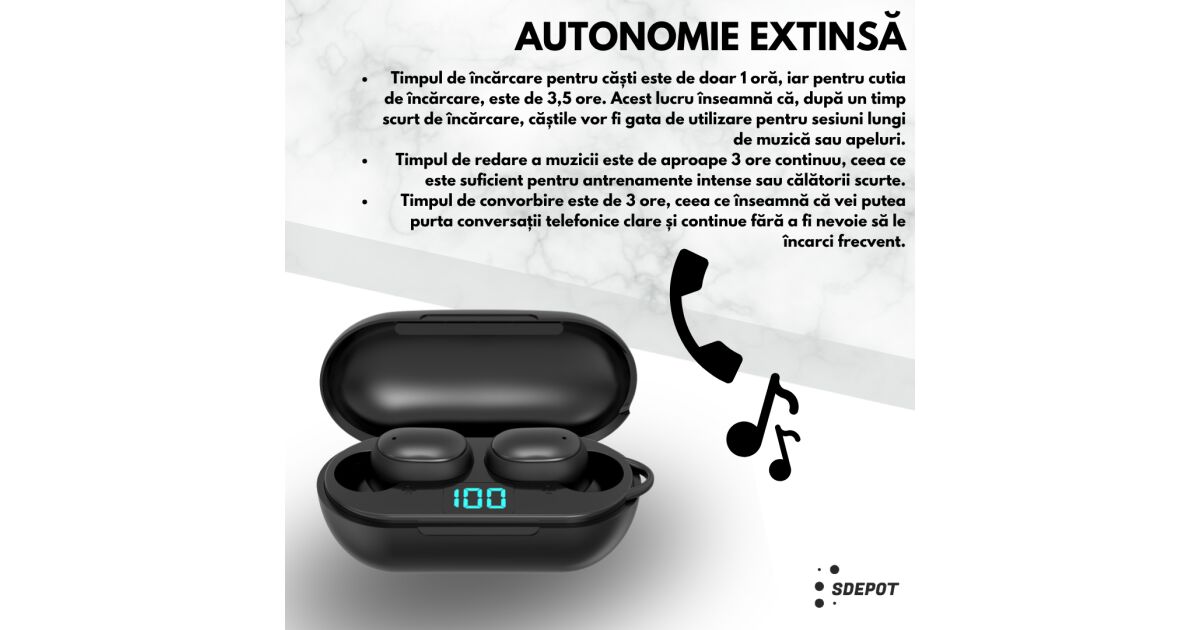 Vezeték nélküli sport fejhallgató, S DEPOT®, zajszűrővel, LED akkumulátor kijelzővel, Bluetooth 5.0
