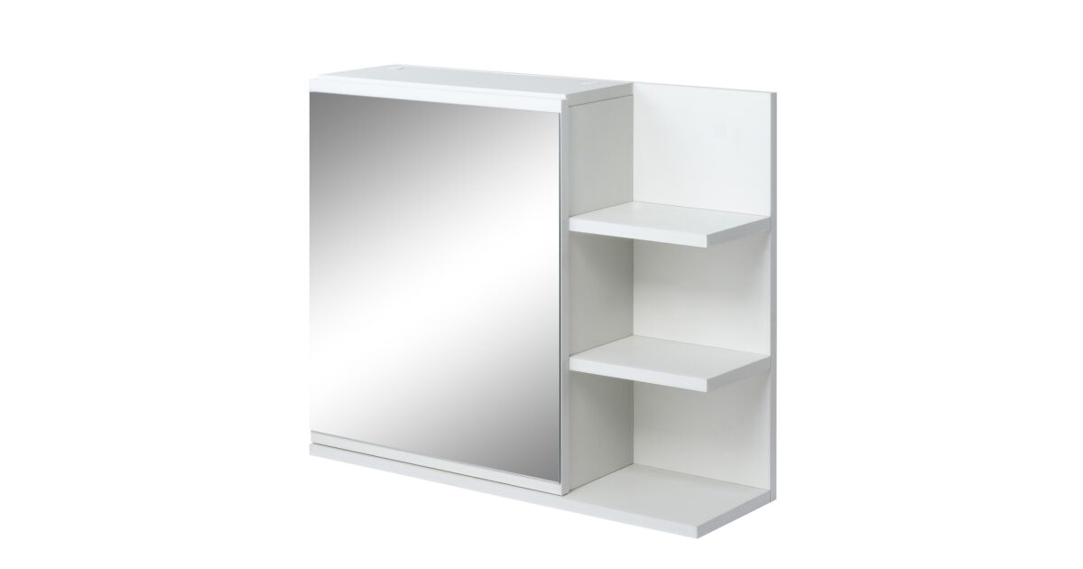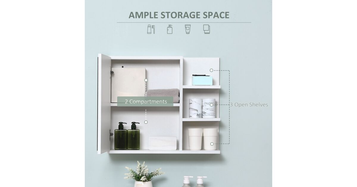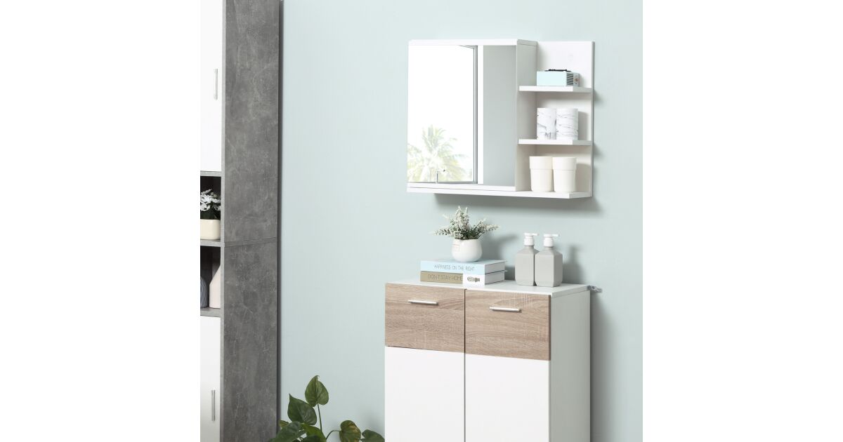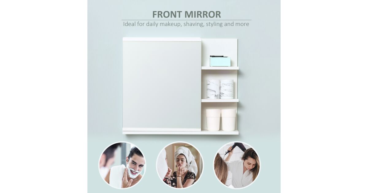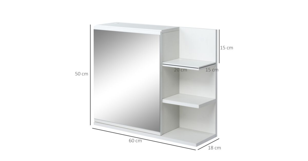 Kleankin Fürdőszobaszekrény Falitükörrel, Függőszekrény Ajtóval, Tükörrel és 3 Oldalsó Polccal, 60x18x50 cm, Fehér leírása