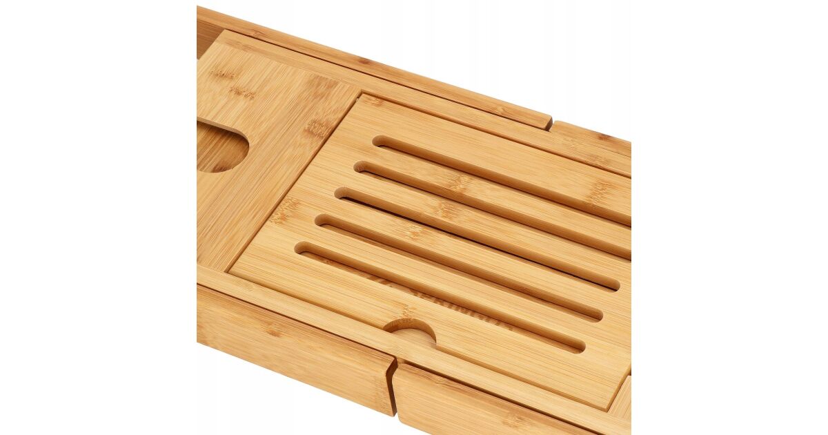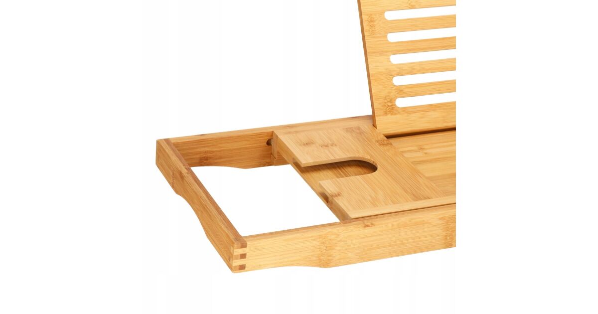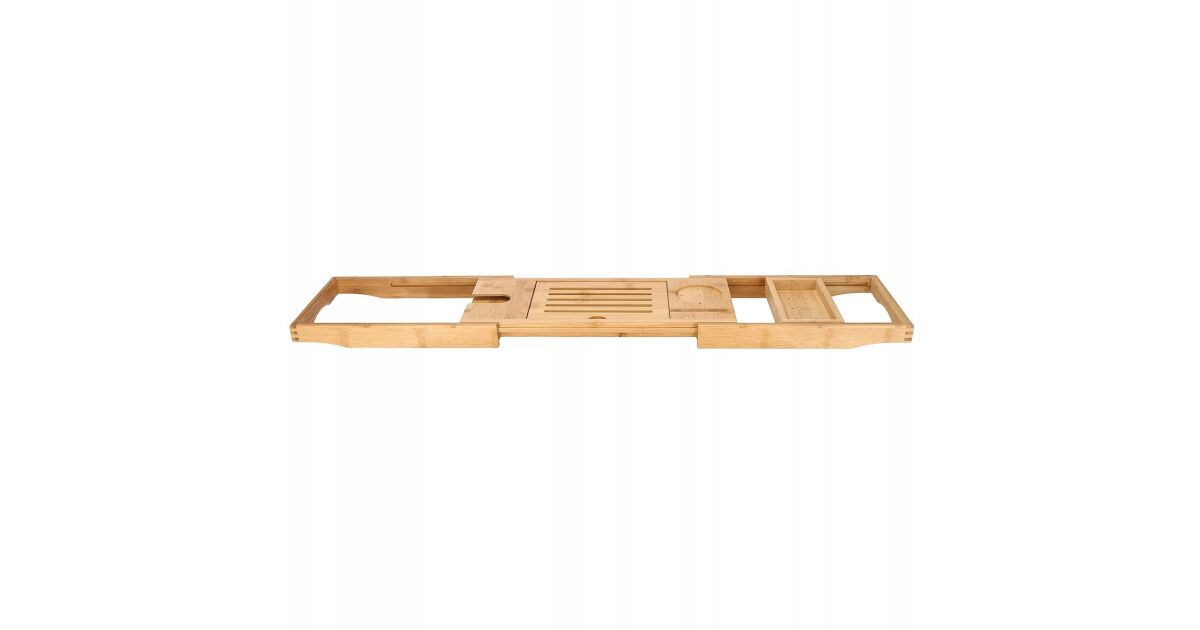 Élvezze a fürdést még jobban ezzel az állítható bambusz fürdőkád polccal! Praktikus tárolóhelyet biztosít a fürdőszobai kellékeknek, könyveknek, tableteknek és telefonoknak, miközben a természetes bambusz megjelenése elegáns kiegészítője fürdőszobájának.