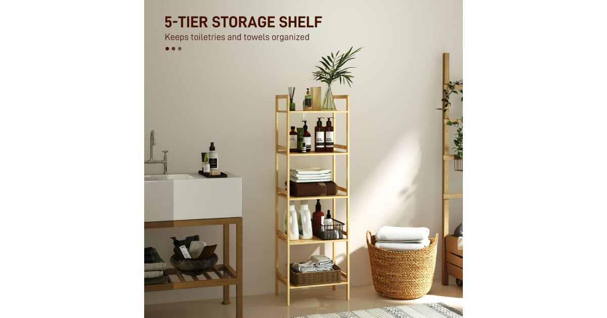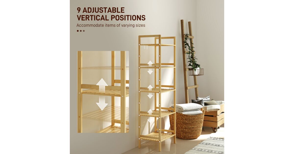 Ez a HOMCOM bambusz polc tökéletes megoldás fürdőszobád vagy más helyiségeid rendszerezésére. Az 5 állítható polccal könnyedén tárolhatsz törölközőket, kozmetikumokat, növényeket vagy bármi mást, amire szükséged van.