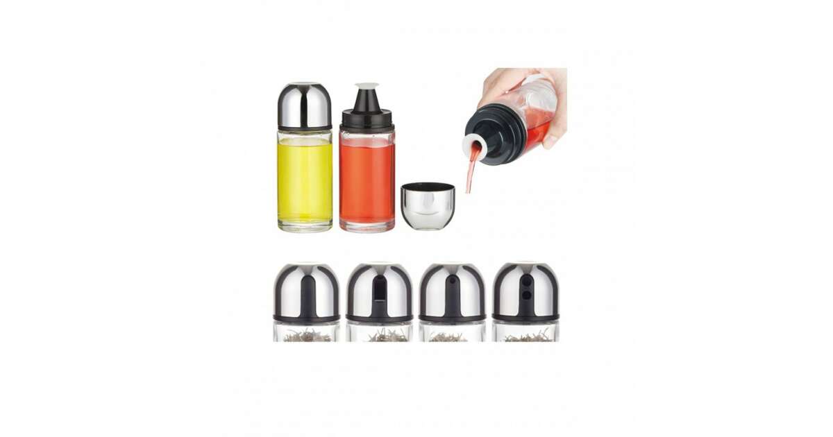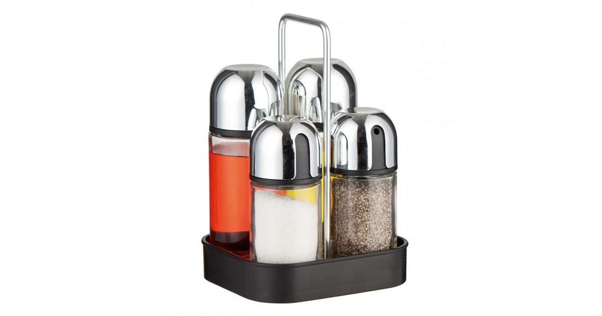 A készlet ideális olaj, ecet, só és bors tárolására és adagolására. A króm tetőkön található nyílások segítségével könnyedén adagolhatod az ízesítőket. A stabil talpnak köszönhetően a készlet biztonságosan áll az asztalon.