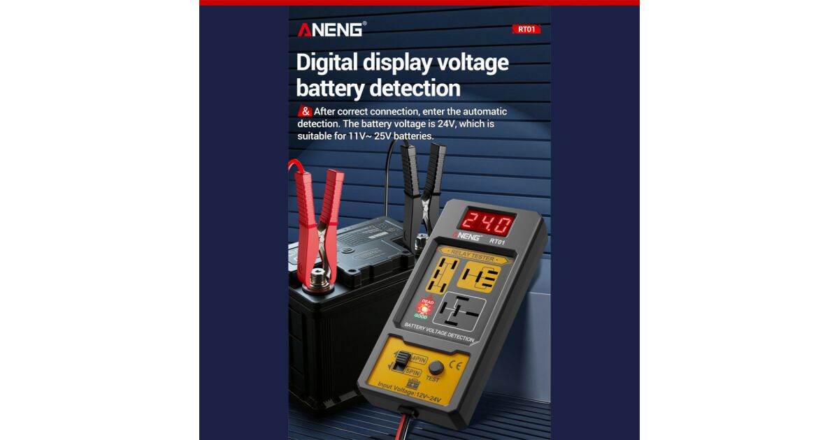 Műszaki adatok: ----------------------- o Márka: ANENG® o Tápfeszültség: 12V / 24V DC o Támogatott relék: 4 PIN / 5 PIN o Kijelző: LCD digitális o Tároláshoz megfelelő: * Hőmérséklet: -20°C ~ 60°C * Páratartalom: 20% ~ 90% (RH) o Aligátorcsipesz szélesség: 0cm - 2,1cm o Méret (h x sz x m): 15mm × 27mm × 140mm o Súly: 200 g o Külön áramforrást nem igényel (Használatához az autó akkumulátora biztosítja az áramot)