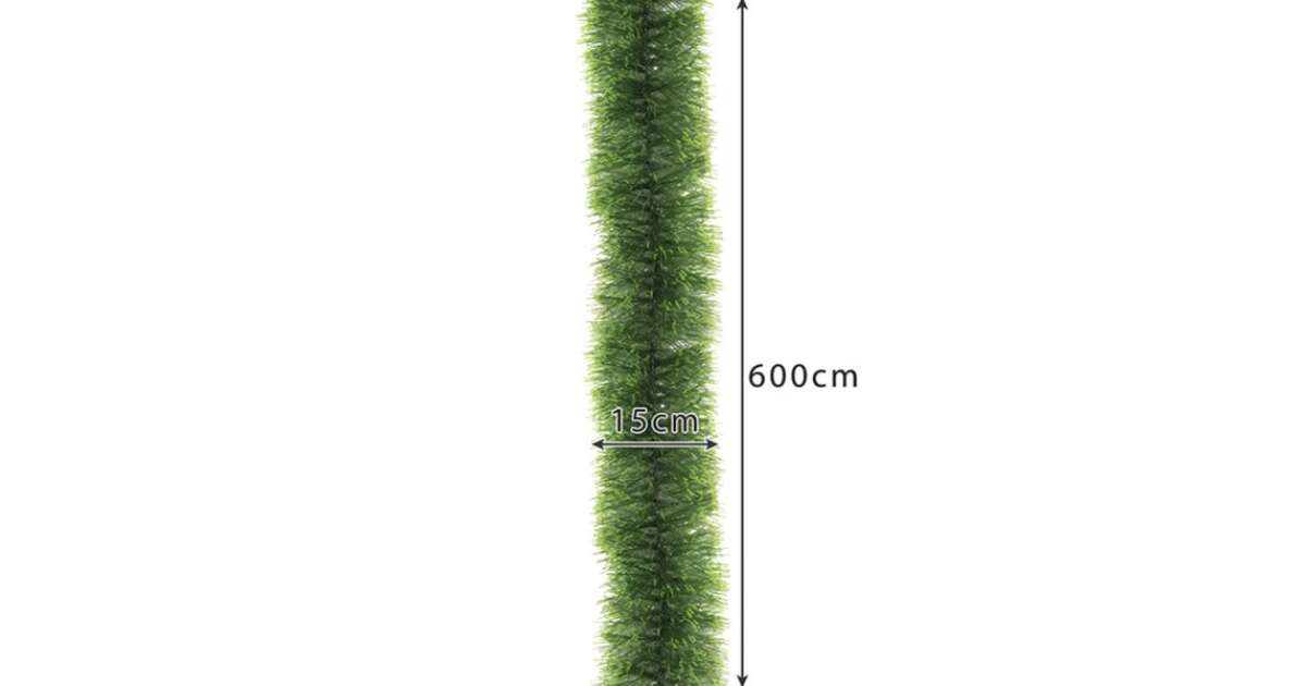 Díszítsd otthonod ünnepi hangulatú, 6 méter hosszú karácsonyi girlanddal! Ez a műanyagból és fémből készült girland 15 cm széles, és sűrű, puha fenyőágakkal van tele, így tökéletesen illeszkedik karácsonyfádhoz vagy más dekorációdhoz. A gazdag zöld színű girland könnyen formázható, és garantáltan ünnepi hangulatot teremt otthonodban.