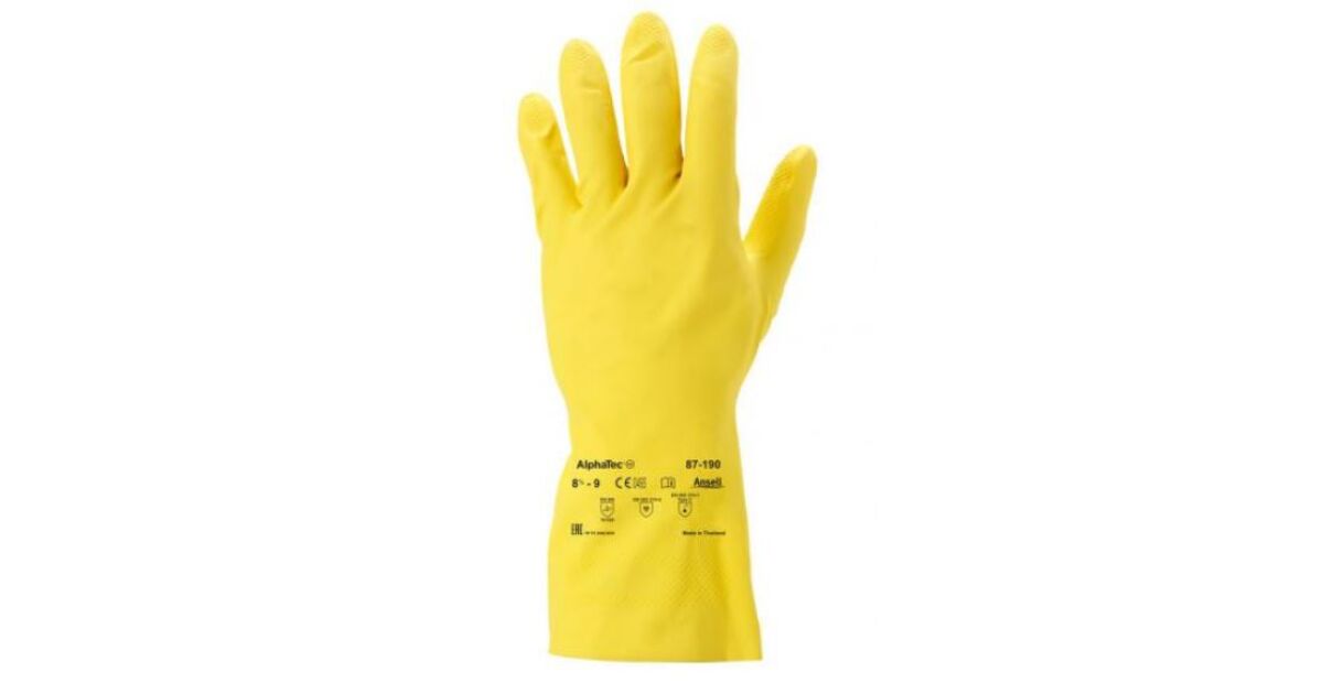 Az Ansell AlphaTec 87-190 gumikesztyűk ideálisak számos feladathoz, legyen szó ipari munkáról, általános teendőkről, házimunkáról, építkezésről vagy akár élelmiszeripari tevékenységről. A természetes latex guminak és a pamutflokkolt belső résznek köszönhetően kényelmesek és védelmet nyújtanak.
