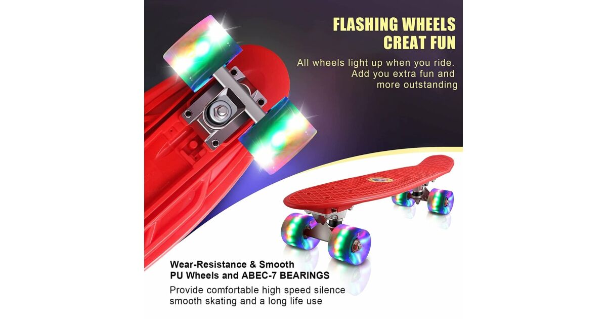 Gördeszka világítással, gyerekeknek 4 éves kortól, ABEC-7 csapágyak, szilikon kerekek, 55 x 14,5 cm, kék/vörös, Piros leírása