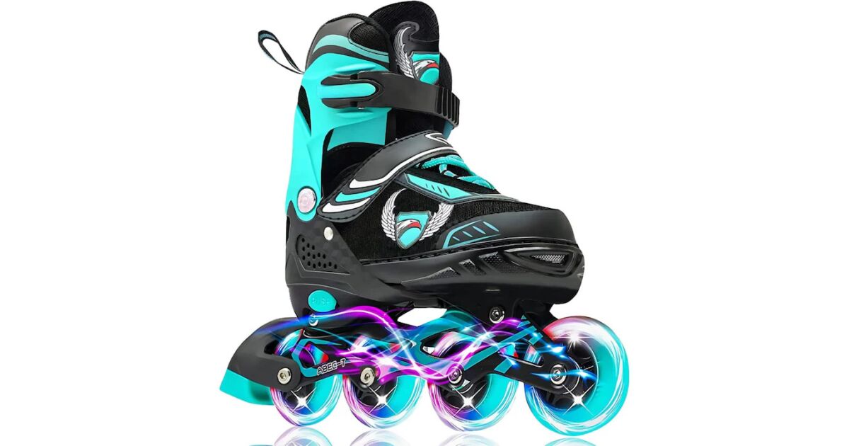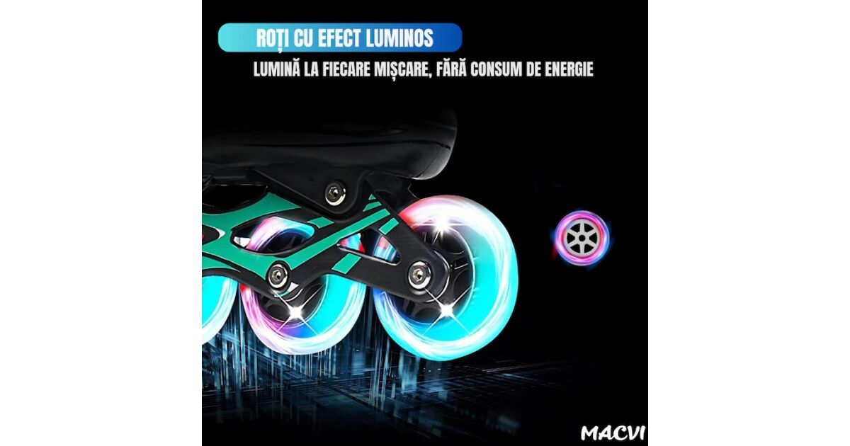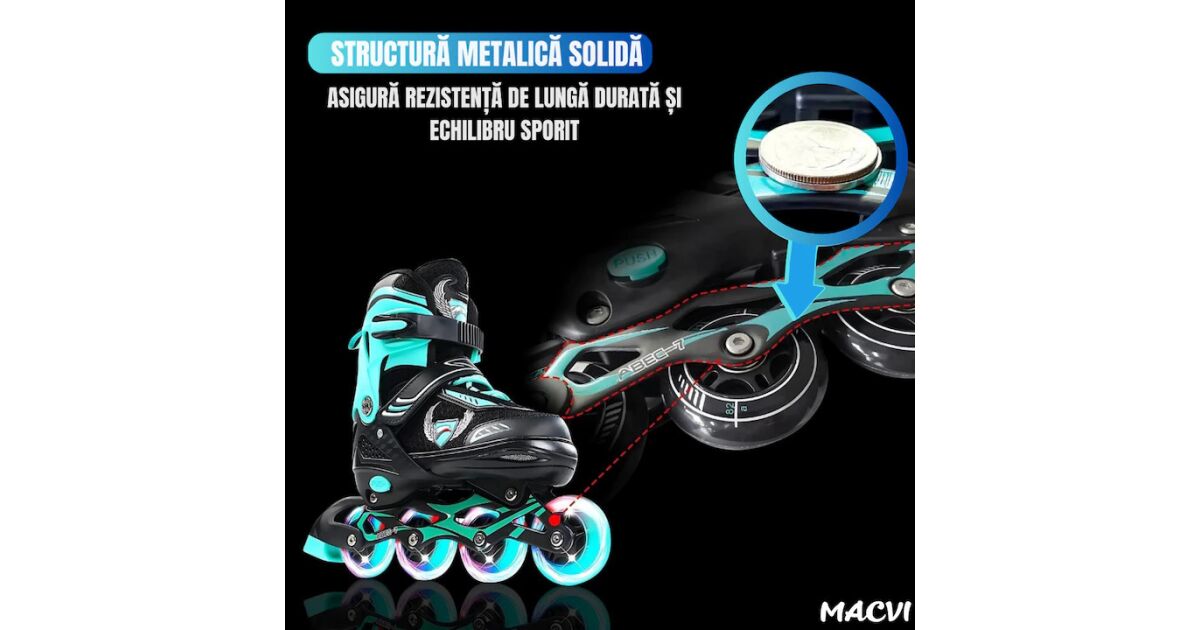 Ezt a terméket így is ismerheted: Macvi® türkizkék állítható görgők, gyermekek és felnőttek, L 38-41 méret, világító szilikon kerekek, ABEC-7 csapágyak, alumínium nyereg, hármas fogantyú.