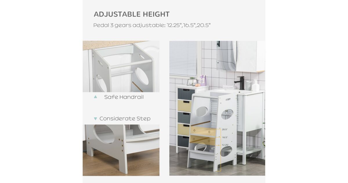 - 🪜 3 állítható szint: A platform magassága könnyen beállítható a gyermek növekedéséhez igazodva (31 cm, 42 cm, 52 cm).