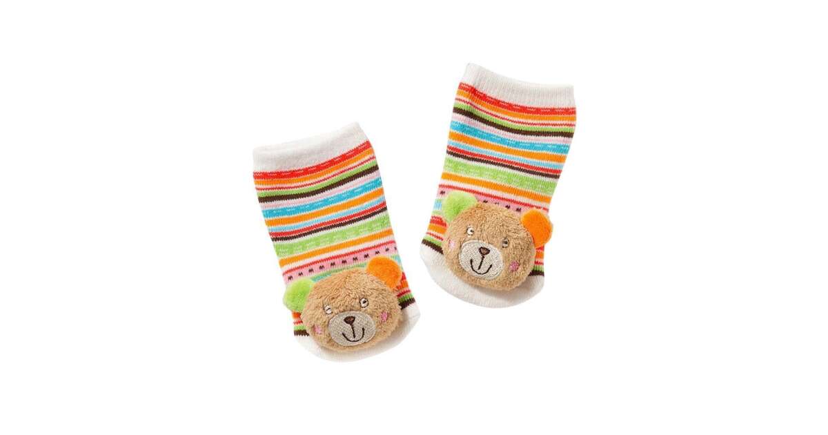 Ezek a cuki, színes csíkos zoknik vidámságot visznek a babád mindennapjaiba! A puha medvefülek és a beépített csörgők szórakoztatják a kicsit, miközben serkentik a lábfej fejlődését és a játékot. Kényelmes viseletet biztosítanak a babának, és könnyen tisztíthatók.