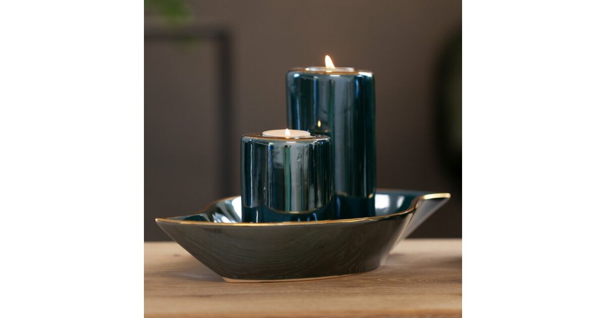 Két darab elegáns, sötétzöld kerámia gyertyatartó, aranyozott részletekkel. Tökéletes választás otthonod hangulatának feldobására, vagy akár ajándékba is. A minimalista design bármilyen stílushoz illik.
