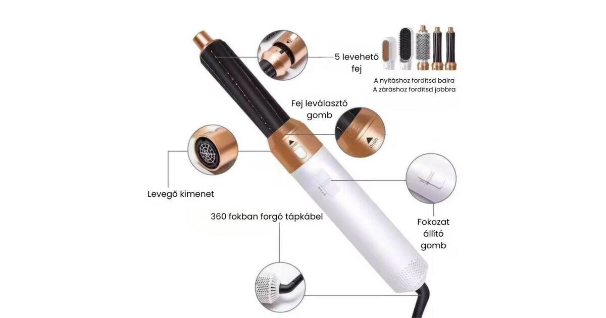 Ezt a terméket így is ismerheted: 5 az 1-ben Professzionális Hajformázó Cserélhető Fejekkel, Gyors Melegedéssel, Egyenes és Hullámos Hajhoz - Fehér-Arany - WT-618