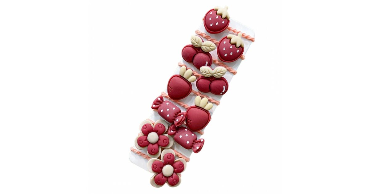 - Aranyos gyümölcsös és állatos design: Eper, cseresznye, virág, nyuszi, maci és édesség formájú díszek.