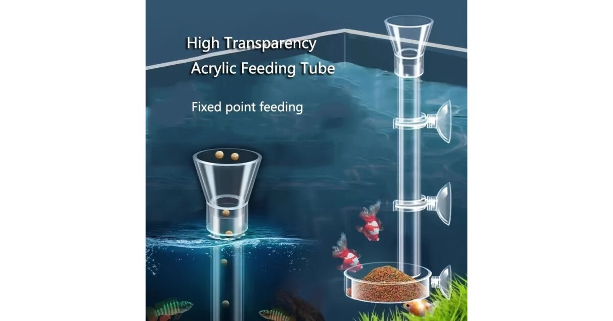 (Anyagösszetétel) Az etetőcső és tál kiváló minőségű akrilból készült, amely tartós és ellenálló a víz alatti környezetben.