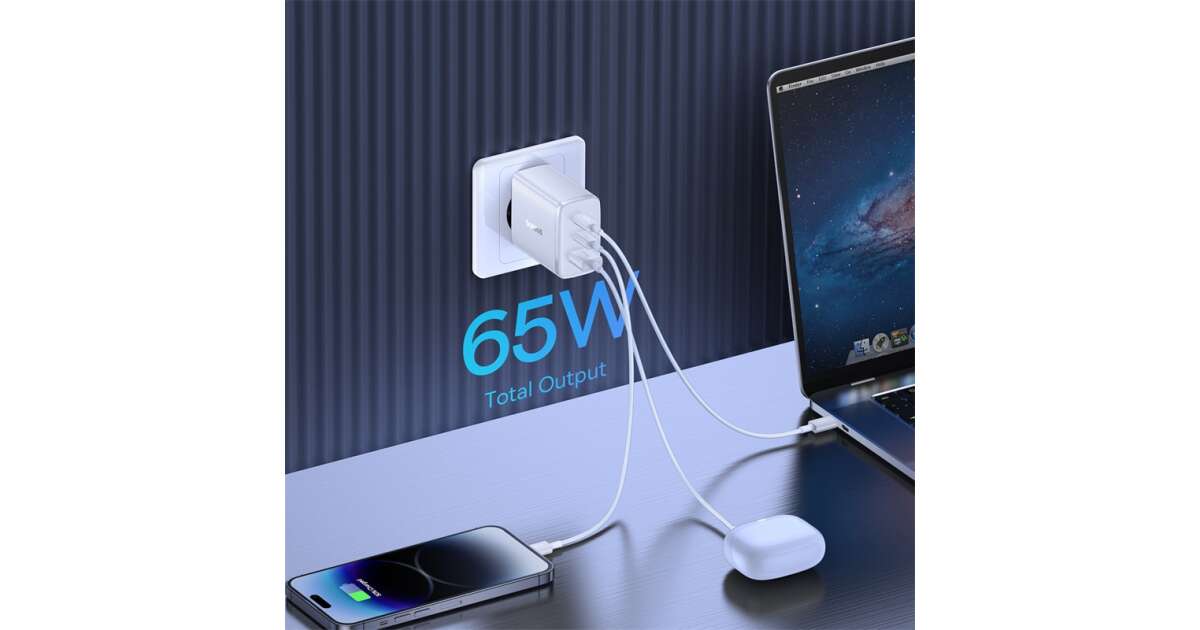 - 65W-os teljesítmény: Villámgyors töltés okostelefonokhoz, tabletekhez és laptopokhoz. ⚡
