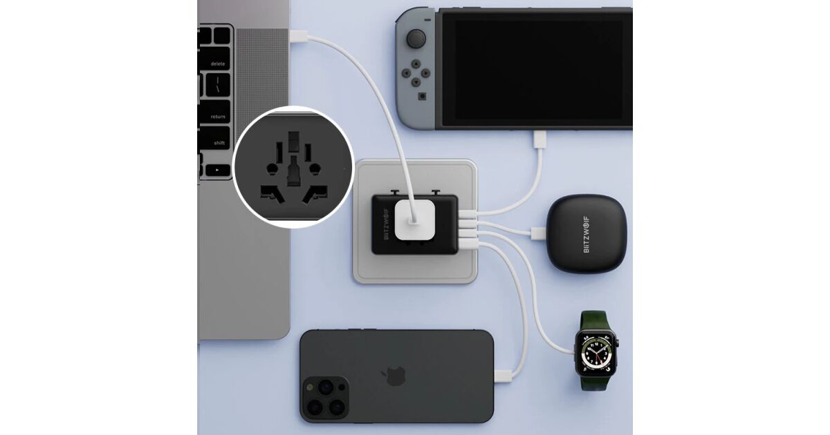 BlitzWolf® BW-TA1 - EU UK US AU Átalakító utazó aljzat és 2x USB Type C + 2x USB-A töltő leírása