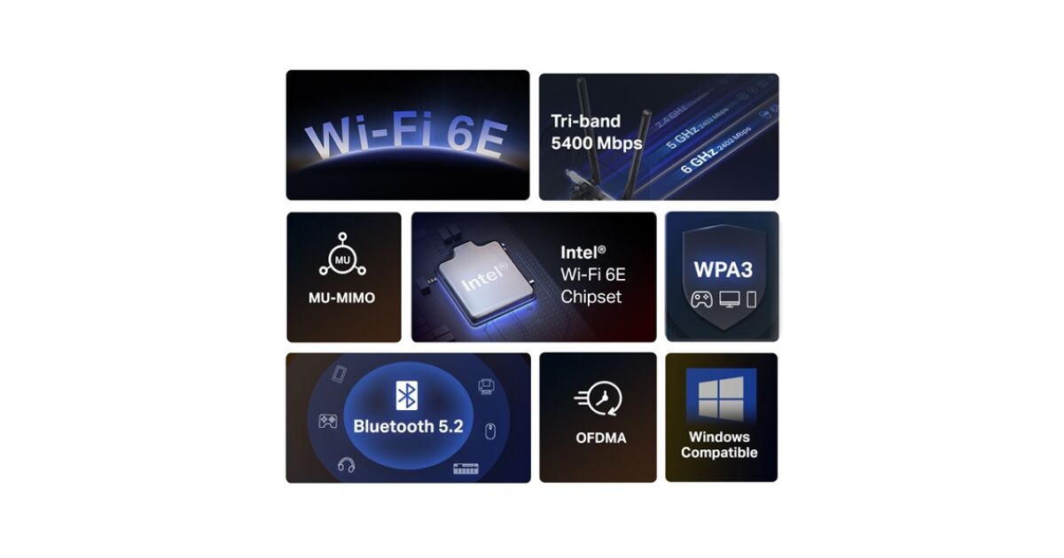- AXE5400 Wi-Fi 6E Bluetooth 5.2 PCIe adapter (MA86XE)