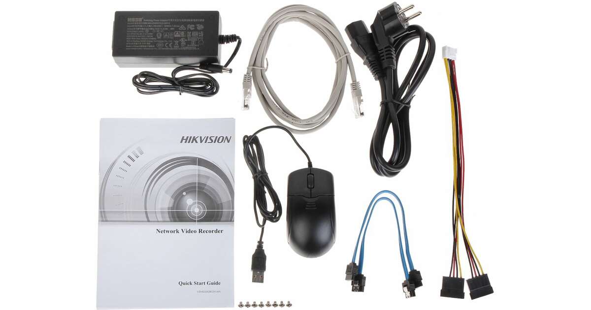A csomag tartalmazza a Hikvision NVR-t, a tápegységet, a hálózati kábelt, az egér, valamint a szükséges csatlakozókat és a használati útmutatót. 🖱️🔌