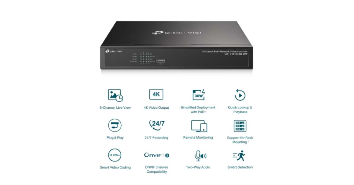 Ez a TP-Link VIGI NVR1008H-8MP 8 csatornás PoE+ hálózati videorögzítő ideális megoldás otthoni vagy kisvállalati megfigyelési rendszerekhez. A beépített PoE+ technológiának köszönhetően egyszerűen telepíthető és konfigurálható, akár 8 db 8 MP-es kamerát is támogat.
