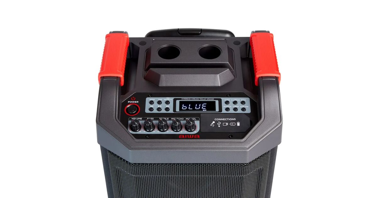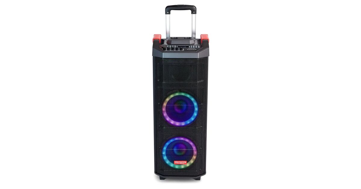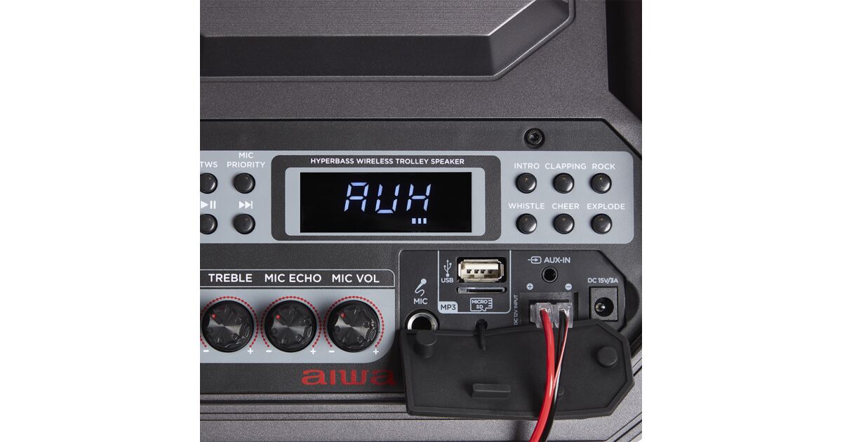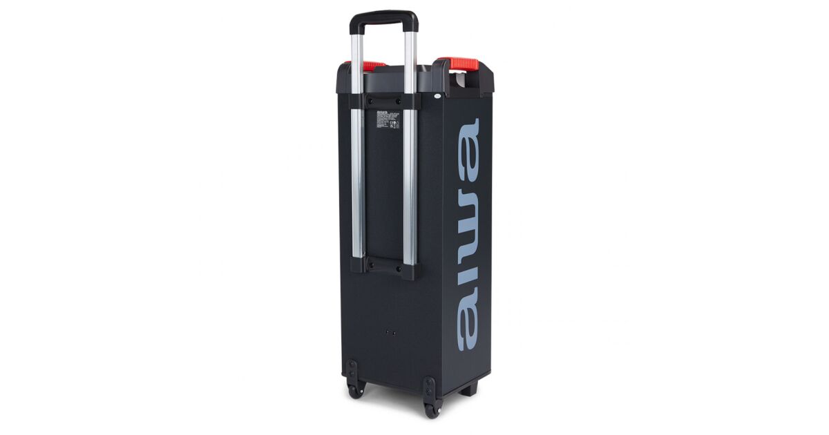 -Aiwa KBTUS-608 FIRE Nagy teljesítményű party hangrendszer, 600 W P.M.P.O. teljesítmény (80W RMS), Bluetooth 5.0, True Wireless Stereo (TWS), USB-port, Micro-SD, AUX, Két VHF vezeték nélküli karaoke mikrofon, 5-8 órás lejátszás