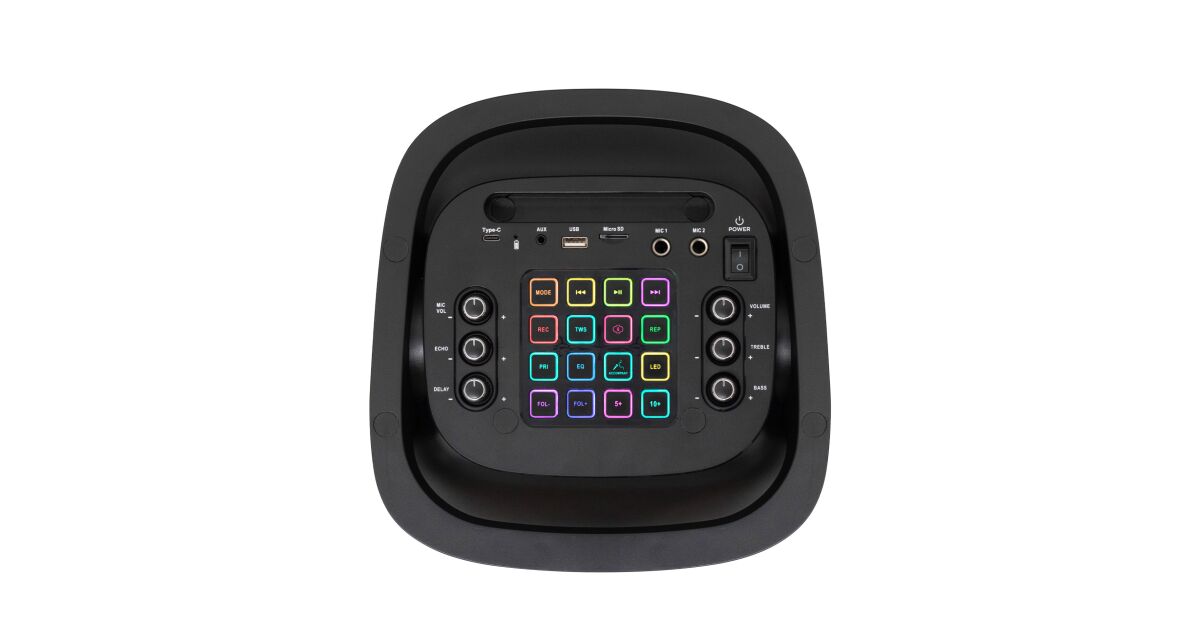 Az MP3 lejátszás USB vagy microSD eszközről, a magas/mély/EQ hangszínszabályozás minden jelforráshoz lehetőséget ad a tökéletes hangbeállításra. A telefontartó nyílás és a fehér digitális kijelző kényelmes használatot biztosít. A látványos, kikapcsolható LED fényeffektek, a két mikrofon csatlakozó visszhangosítható KARAOKE funkcióval és a mikrofon hangjának felvétele USB/microSD tárolóra tovább növelik a hangrendszer sokoldalúságát. Az AUX audio bemenet (3.5mm) további külső eszközök csatlakoztatását is lehetővé teszi.