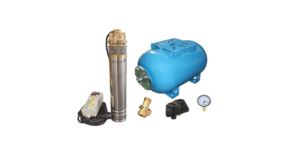 Komplett hidrofor rendszer készlet, Omnigena SKM 150/100 merülő szivattyú, 100 literes tartály, nyomáskapcsoló, 5 utas csatlakozás, manométer