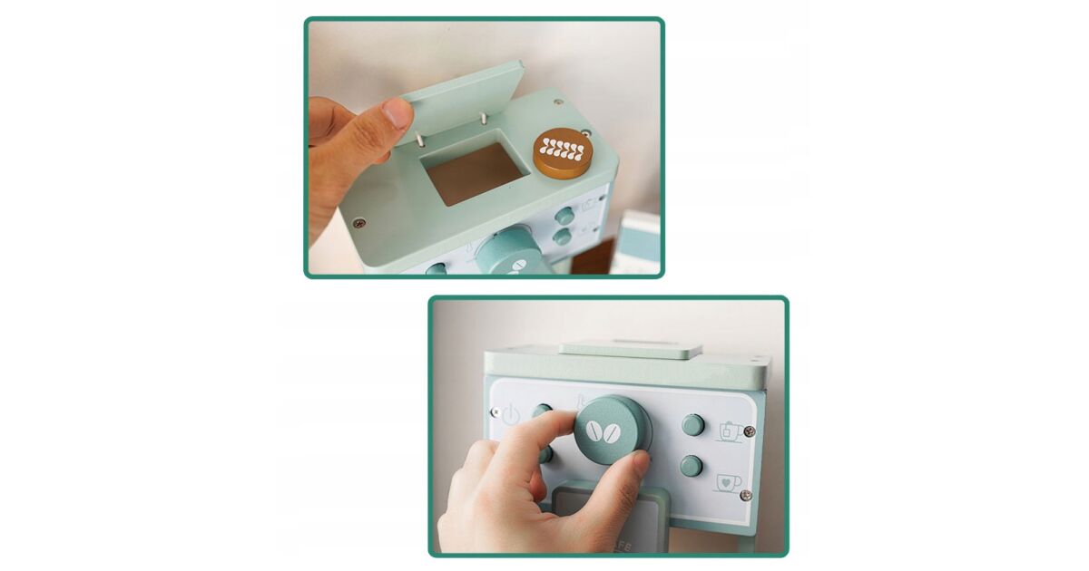 Főbb jellemzők: Gyönyörű pasztellszínek Kiváló minőségű kivitelezés Mindegyik fából készült Nyitható kávés tartály Mozgatható gomb és gombok Teljes készlet, ideális kávéfőzős összejövetelekhez Sok kreatív szórakozás