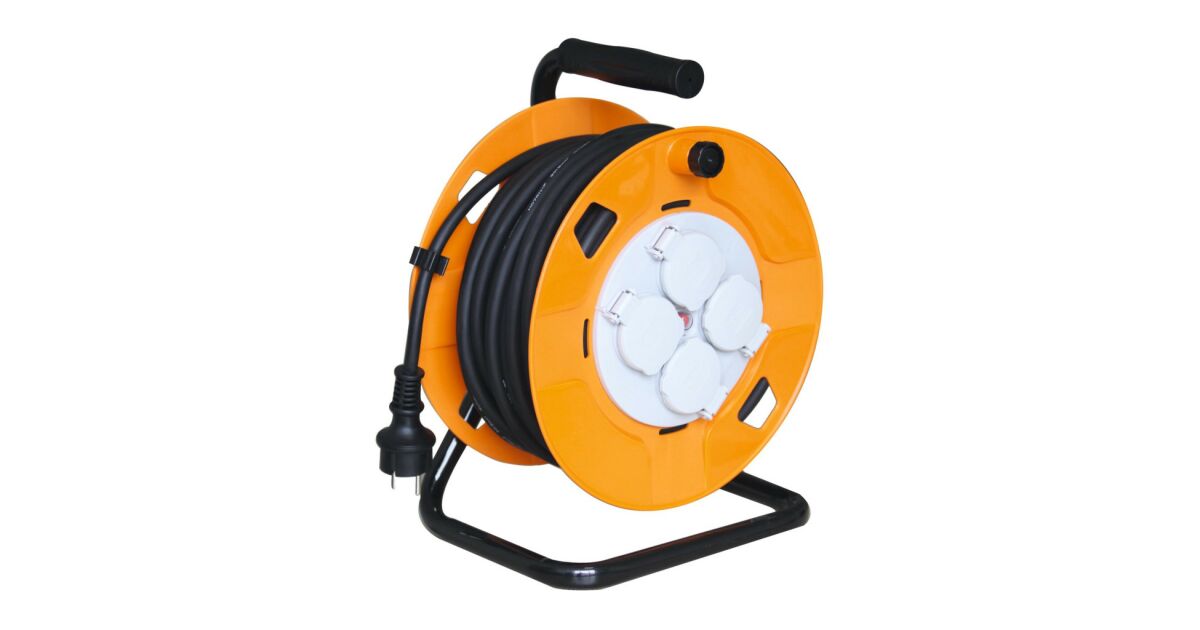 Ezt a terméket így is ismerheted: Home HJR 10-50 kábeldob, 50 m, fém talp, IP44-es védelem, H07RN-F 3G1,5 mm2 kábel gumi kábel, max. 3000 W, 4 aljzat takarófedéllel, védőkapcsoló