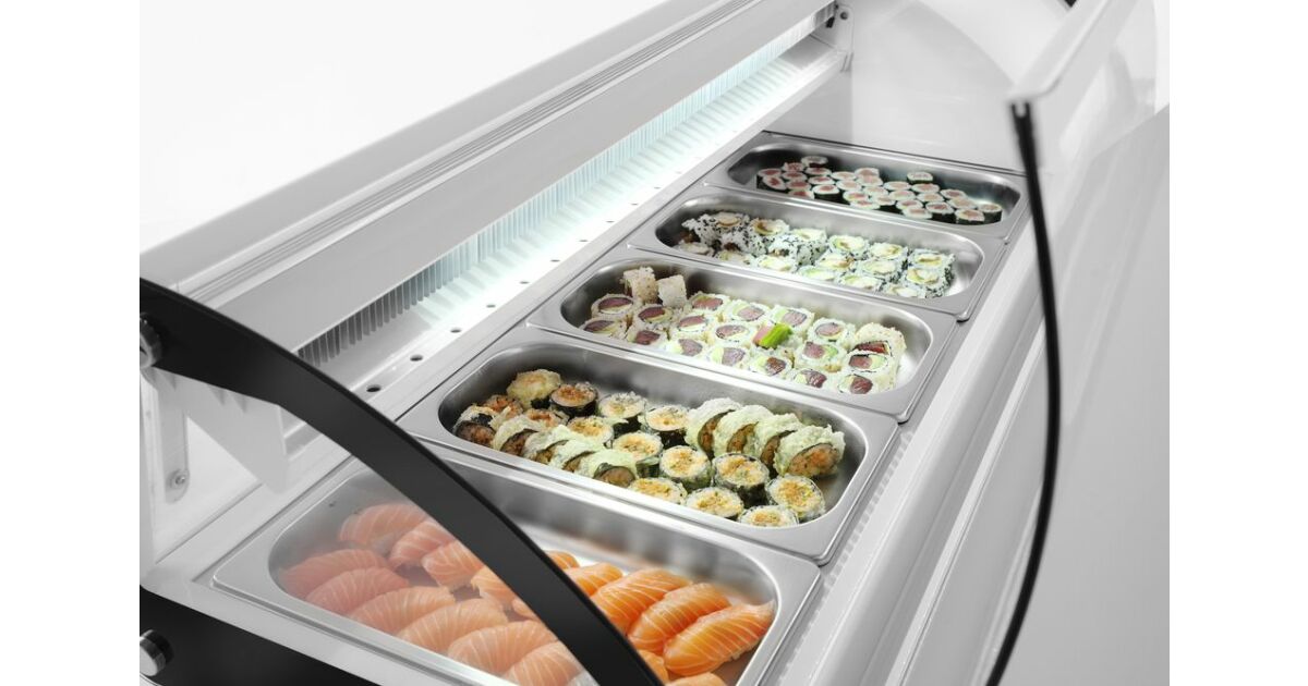 Ez az Arktic sushi hűtőpult tökéletes választás éttermedbe vagy sushi bárodba, hogy frissen és vonzóan kínáld a finom falatokat. Az ívelt üvegfelület és a LED világítás garantálja, hogy a sushik ellenállhatatlanul nézzenek ki.